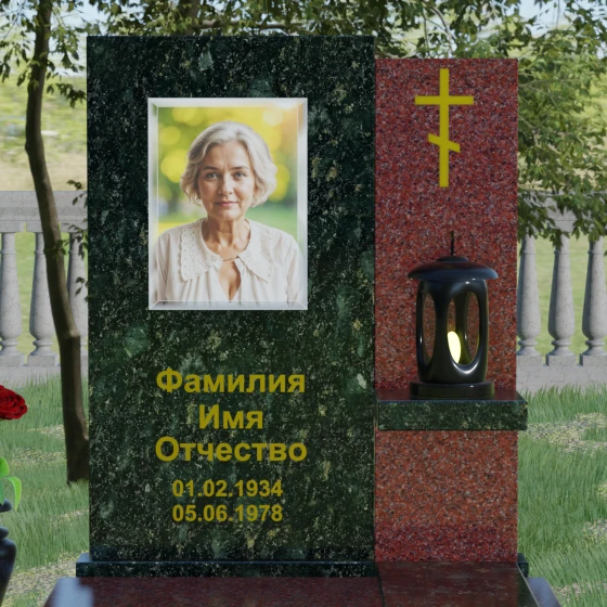 Представленная модель отличается изысканной асимметрией и сложной геометрией, где две вертикальные стелы разной высоты сливаются в единый гармоничный ансамбль. Левая часть, более высокая и массивная, имеет плавный дугообразный срез в верхней части. Этот мягкий изгиб символизирует бесконечность жизненного пути и обретенный вечный покой, смягчая строгость натурального камня. На этой панели располагается портрет и основная информация, выполненная глубокой гравировкой с золочением. Правая часть композиции, выполненная из контрастного камня, служит духовным акцентом: на ней закреплен лаконичный православный крест, сияющий золотом, что подчеркивает веру и надежду на вечную жизнь.