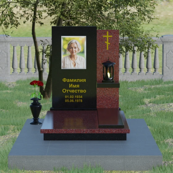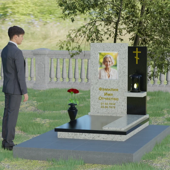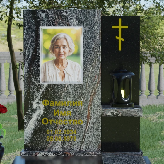 Кому подойдет: Данная модель является универсальной благодаря своему лаконичному и одновременно глубокому дизайну. Она станет достойным выбором как для мужчины, так и для женщины. Строгость линий и золотые акценты подчеркнут статус и мужество, а плавные изгибы верхней грани привнесут нотки женственности и нежности. Этот мемориал выбирают те, кто хочет выразить глубокое уважение и создать на кладбище место, преисполненное достоинства и тишины, где каждый элемент — от лампады до фактуры камня — говорит о вечной любви.
