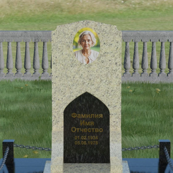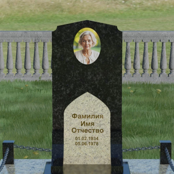 Данное надгробие из натурального камня представляет собой архитектурный ансамбль, в котором строгость линий гармонично сочетается с мягкостью художественных акцентов. Визуальный центр композиции — сложная вертикальная стела, выполненная в технике комбинирования двух контрастных пород. Основное полотно из темного, зеркально отполированного камня служит благородным фоном, на котором особенно выразительно смотрится светлая фигурная вставка. Эта вставка, имеющая форму стрельчатой арки, словно открывает «портал» памяти, создавая чистую и светлую зону для нанесения имен и памятных дат. Верхняя грань стелы завершается изящным пятигранным сводом, напоминающим очертания храмовой архитектуры, что придает монументу возвышенный и одухотворенный вид. Игра текстур — от глубокого черного глянца до зернистой матовости светлого гранита — создает объем, который меняется в зависимости от угла зрения.