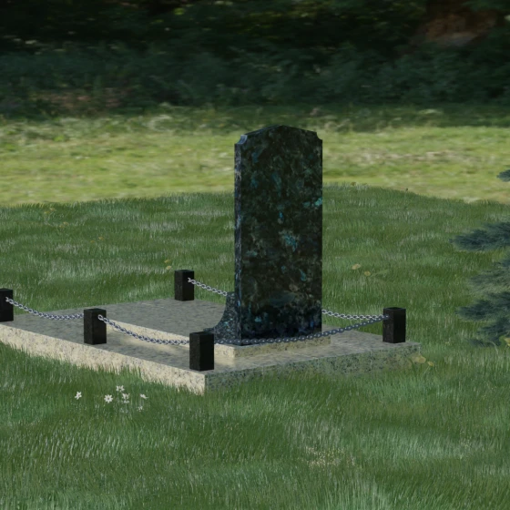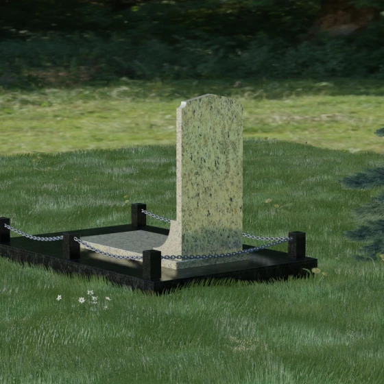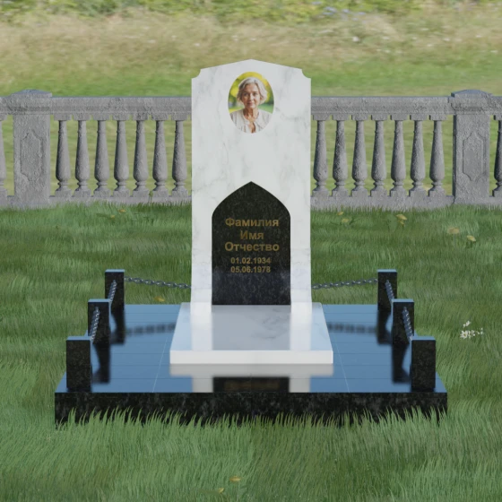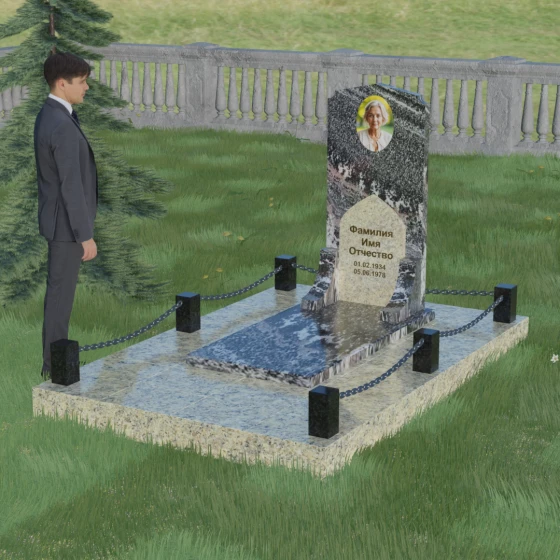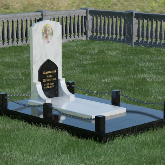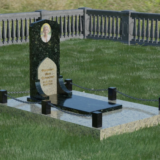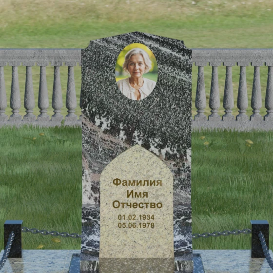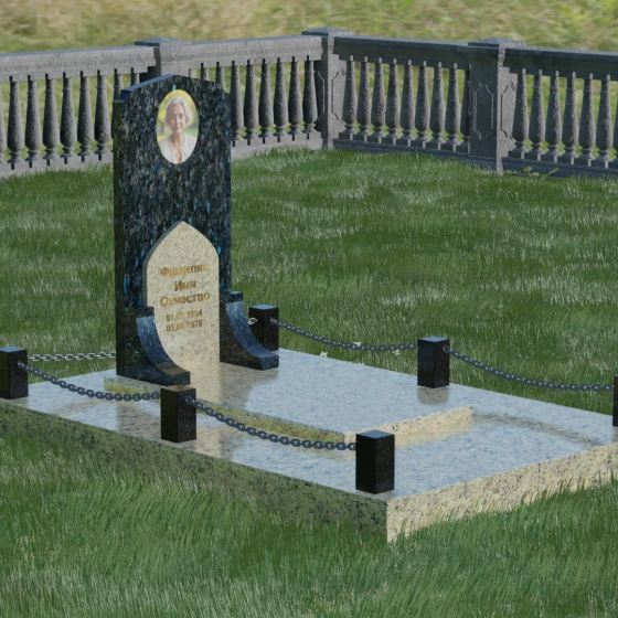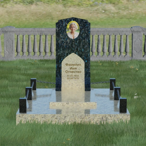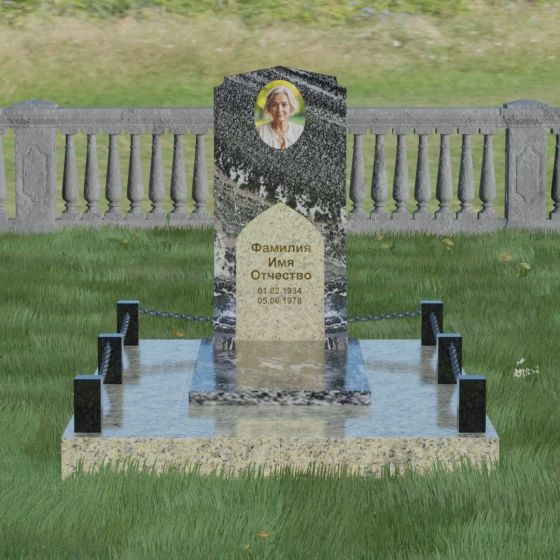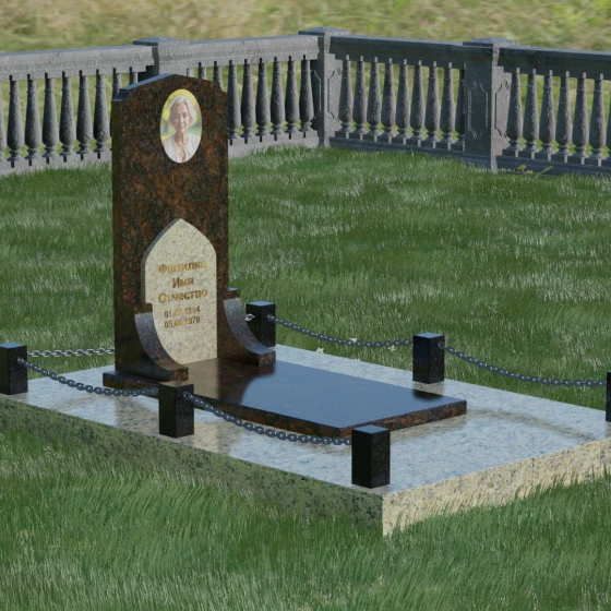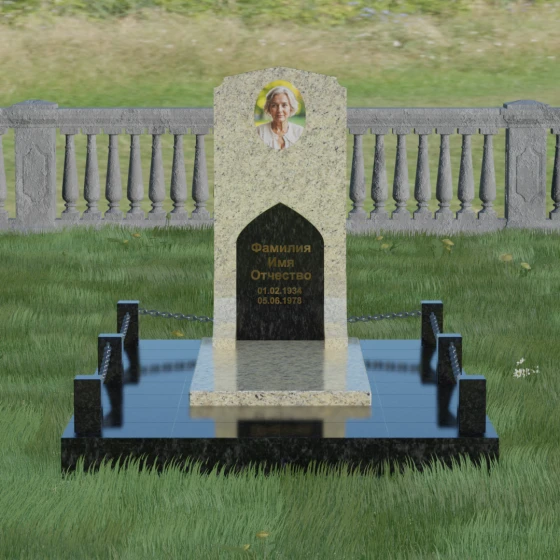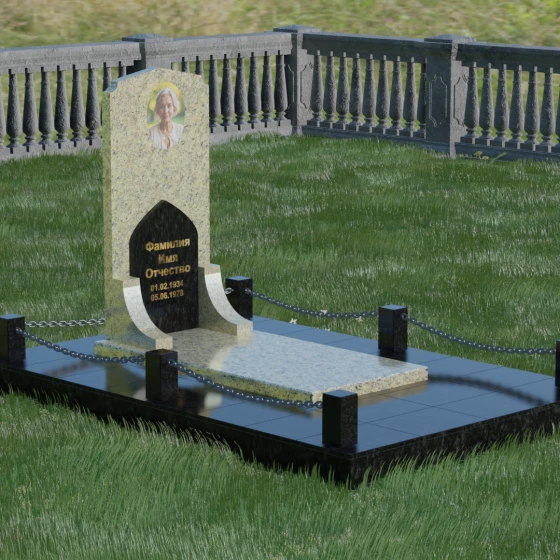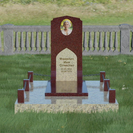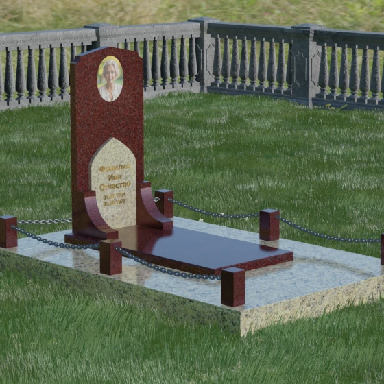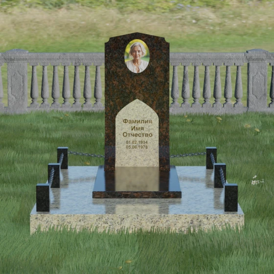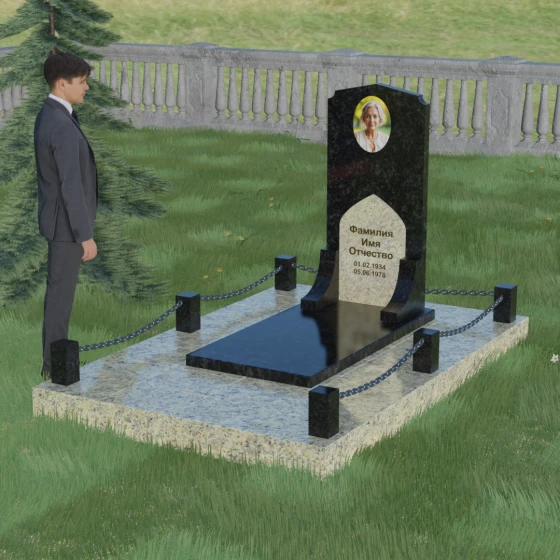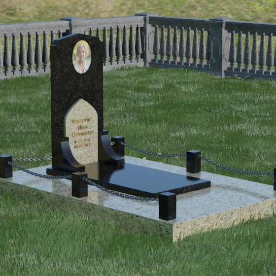 Геометрия стелы идеально приспособлена для размещения портрета в верхней части. Овальный медальон, расположенный по центру, визуально уравновешивает композицию, находясь над «аркой» с текстом. Золоченая гравировка на светлом фоне арки читается легко и четко даже с расстояния. Завершенность участку придают массивные гранитные столбики, соединенные тяжелыми декоративными цепями. Это ограждение не загромождает пространство, но четко обозначает границы частной территории, создавая атмосферу уединения и защищенности. Каждая деталь — от формы фаски на столбиках до надежных креплений цепей — продумана мастерами-камнерезами для того, чтобы мемориал стал достойным воплощением вашей любви и незыблемой памяти на долгие века.