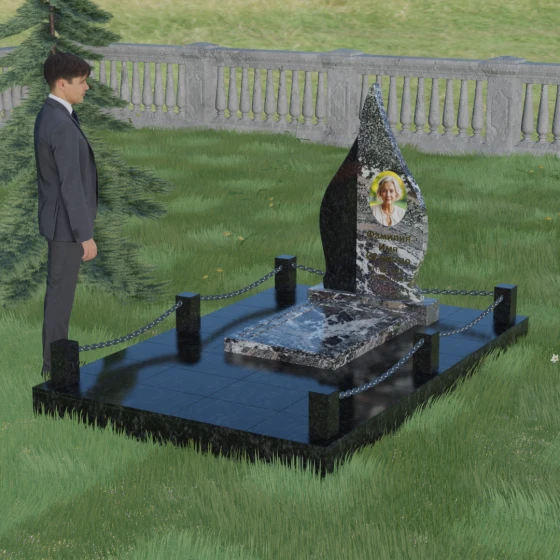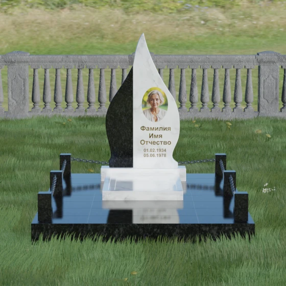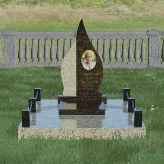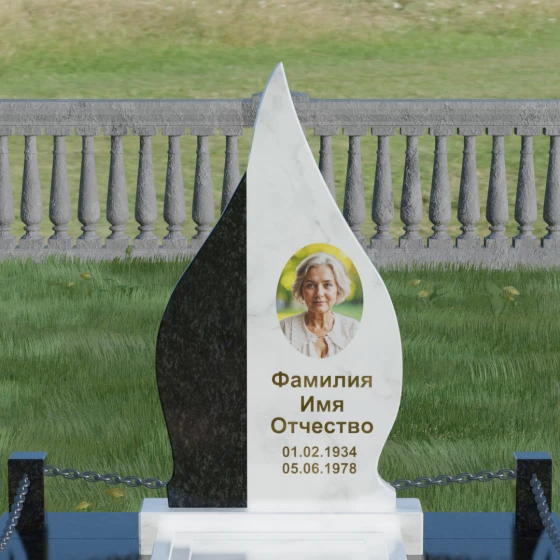 Выбор мемориального изделия — это всегда глубоко личный процесс, стремление выразить в камне ту нежность и уважение, которые мы храним в сердце. Модель 018 воплощает в себе гармонию и завершенность. Величественная стела выполнена в форме изящного, стремящегося ввысь пламени или капли, что символизирует вечный свет души и неугасаемую память. Асимметричная геометрия с мягкими, плавными изгибами лишена острых углов, что подчеркивает идею спокойствия и вечного упокоения. Особое внимание привлекает сочетание двух контрастных видов камня: светлая левая часть стелы с её благородной зернистой фактурой мягко огибает темную зеркальную сердцевину. Этот контраст создает визуальный объем и глубину, подчеркивая уникальность композиции и делая её заметной на фоне традиционных строгих форм.