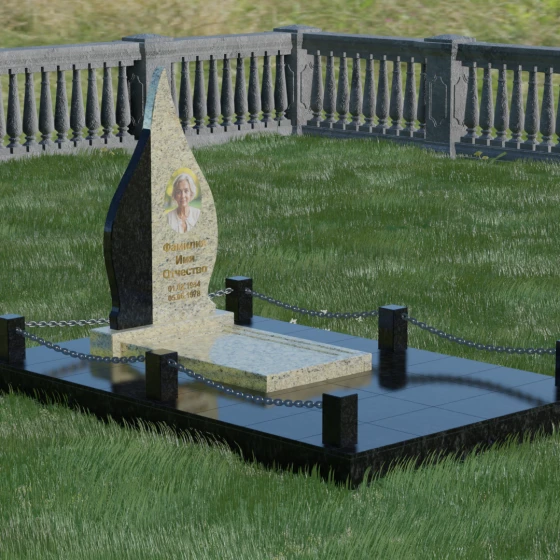 Конструкция модели 018 продумана до мелочей, включая полное благоустройство места захоронения. Монумент устанавливается на массивный двухцветный постамент, который обеспечивает устойчивость всей вертикальной конструкции. Особое внимание уделено обустройству прилегающей территории: вместо открытого грунта используется сплошное мощение плитами из натурального гранита. Это не только придает мемориальному комплексу законченный и достойный вид, но и значительно упрощает уход за ним, исключая появление сорняков и скопление грязи. Периметр участка обозначен строгим и лаконичным ограждением в виде невысоких каменных столбиков-боллардов, соединенных декоративными металлическими цепями. Такая ограда создает приватную зону, не загромождая пространство, и подчеркивает элитарность комплекса.