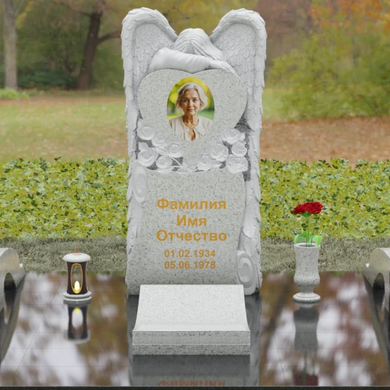 Особое внимание уделено флористическим мотивам. В основании «сердца» вырезаны объемные бутоны роз. Их лепестки, выполненные в технике глубокого барельефа, кажутся живыми и нежными, несмотря на твердость материала. Эти цветы не просто украшают изваяние, они олицетворяют вечную любовь, которая не увядает со временем. Плавные, текучие линии стелы гармонично сочетаются с архитектурной строгостью основания, создавая завершенный и эстетически безупречный ансамбль.