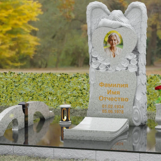 Оформление: Для формы в виде сердца идеально подходит классическая лазерная гравировка или фотокерамика в центре композиции. ФИО и даты жизни рекомендуется наносить сусальным золотом или глубоким пескоструйным методом с последующей окраской под бронзу — это создаст необходимый акцент на фоне темного полированного камня и подчеркнет статусность всего комплекса.