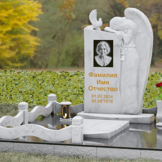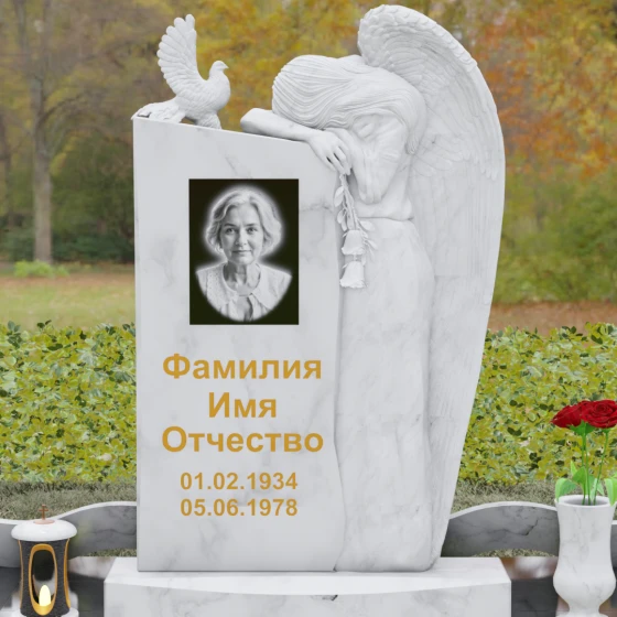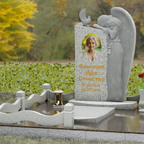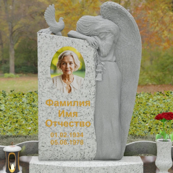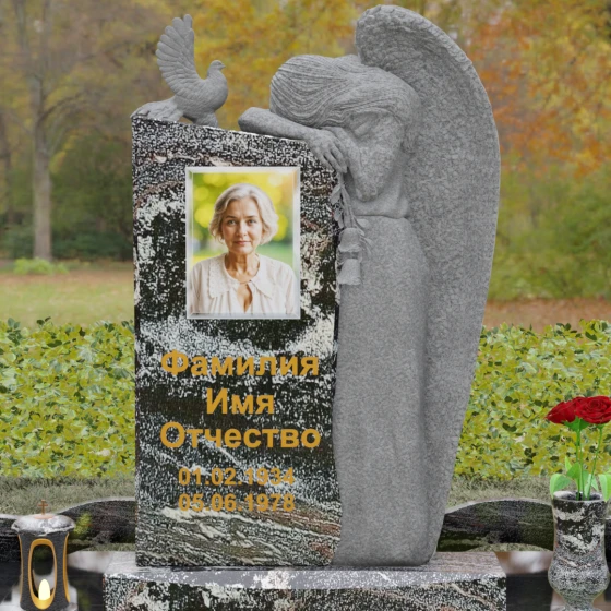 Представленный мемориальный ансамбль (Артикул 129) — это не просто памятный знак, а глубокое архитектурное высказывание, в котором застывшая в камне скорбь обретает форму высокого искусства. Величественная стела доминирует в композиции, представляя собой сложный симбиоз строгой геометрии и филигранной художественной резьбы. Центральным элементом является объемная фигура скорбящего ангела, выполненная в технике глубокого барельефа. Мастерски переданная пластика крыльев с детальной проработкой каждого перышка создает ощущение мягкости, которая парадоксальным образом контрастирует с твердостью натурального камня. Склоненный лик ангела и тонкие складки его одеяний, выполненные в матовом срезе, эффектно выделяются на фоне зеркально полированной поверхности основной плиты. В руках небесного покровителя застыла роза — символ вечной любви, чьи лепестки проработаны с исключительным вниманием к объему и естественности линий.