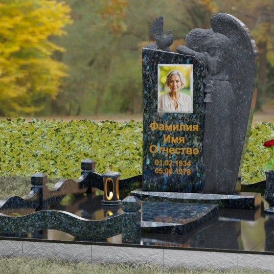 Оформление: Для данной модели мы рекомендуем использовать классическую гравировку портрета в овальной или прямоугольной форме, расположенную в верхней левой части стелы. Сбалансированная композиция позволяет наносить надписи крупным, читаемым шрифтом с возможностью покрытия сусальным золотом или глубокой вырубкой «в ус», что идеально гармонирует с золотистыми и бронзовыми элементами декора, такими как мемориальная лампада или ваза, входящие в состав ансамбля.