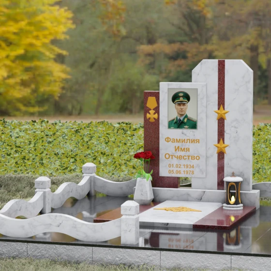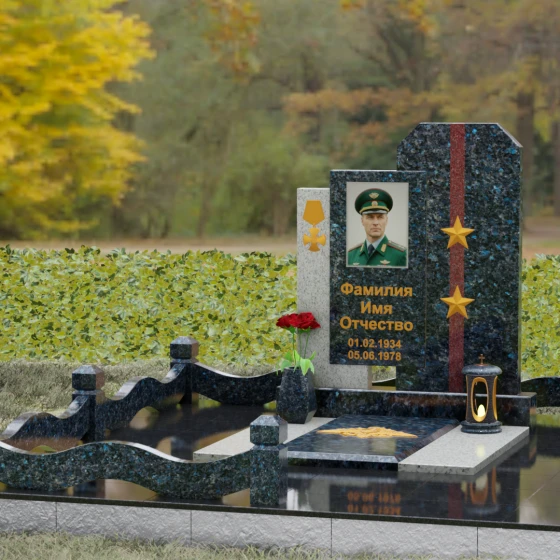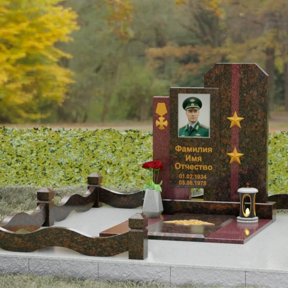 Дизайн Артикула 201 детально продуман. На боковых красных пилонах размещены символы доблести: объемная золоченая медаль на левой части и две пятиконечные звезды на правой. Эти элементы оформления нанесены с высочайшей точностью, создавая эффект металлического литья на граните. Портрет в центральной части помещен в строгую прямоугольную рамку, что придает образу завершенность. Золотое тиснение текста (фамилии и дат) на темном фоне создает благородный контраст и обеспечивает читаемость надписей на долгие годы. Надгробие из натурального камня установлено на массивный цоколь, который служит фундаментом всей композиции. Периметр участка оформлен каменным ограждением с плавными, волнообразными линиями, которые визуально смягчают строгость вертикальных стел. Наличие каменной вазы у подножия позволяет всегда поддерживать порядок, украшая место памяти живыми цветами.