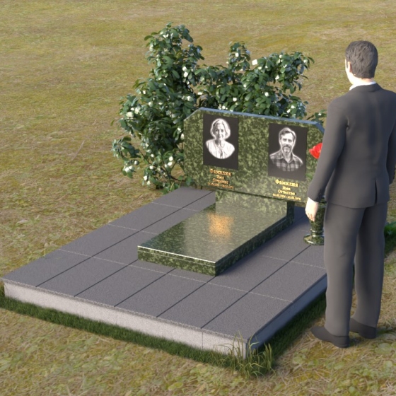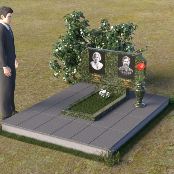 Композиция памятника строится на контрасте строгих геометрических форм и плавных линий, символизирующих жизненный путь и обретение покоя. Стела имеет форму, близкую к прямоугольнику, но с элегантно скошенными углами, смягчающими ее строгость. Верхняя часть стелы имеет две небольшие грани, словно фацеты драгоценного камня, добавляющие ей изысканности. Поверхность камня отполирована до зеркального блеска, что подчеркивает глубину черного цвета и создает ощущение торжественности. На лицевой стороне размещены портреты усопших, выполненные с высокой степенью детализации. Ниже портретов выгравированы надписи, выполненные строгим шрифтом. Справа от стелы установлена небольшая ваза, выполненная в том же стиле, что и памятник, и украшенная простым, но элегантным орнаментом.