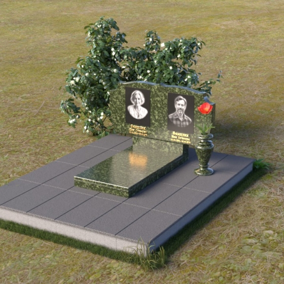 Композиция монумента строится на контрасте плавных линий и строгих геометрических форм. Верхняя часть, несущая на себе портреты усопших, имеет форму, напоминающую раскрытую книгу или свиток, где каждая страница хранит историю жизни. Края этого "свитка" искусно обработаны: верхняя грань словно оплавлена временем, приобретая мягкие, неровные очертания, а боковые стороны имеют более четкий, но все же сглаженный профиль. Фаска, идущая по периметру, придает верхней части визуальную легкость, отделяя ее от основания. Нижняя часть представляет собой прямоугольную плиту с зеркальной полировкой, отражающей небо и окружающий мир, создавая эффект бесконечности и связи с ушедшим. Она словно портал, соединяющий мир живых и мир мертвых, напоминая о непрерывности бытия. Боковины плиты имеют четкую геометрию, подчеркивая основательность и незыблемость памяти.