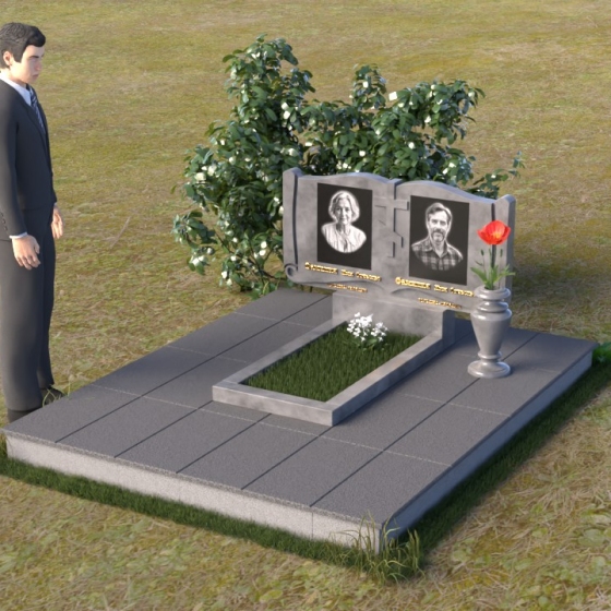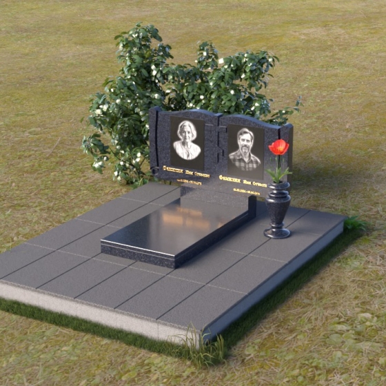 Ритуальное изделие ПГ036 представляет собой сдержанную, но исполненную достоинства композицию, созданную для сохранения памяти о близких. Два прямоугольных элемента стелы, соединенные вместе, образуют волнистый верх, напоминающий раскрытую книгу судеб. Грани обеих частей искусно обработаны, создавая мягкий, обтекаемый силуэт. Зеркальная полировка черного гранита служит идеальным фоном для гравировки портретов и надписей, словно запечатлевая светлые воспоминания в вечном камне. Слева и справа, в верхней части стелы, вырезаны лаконичные кресты, символизирующие веру и надежду. Тонкие линии врезаются в полированную поверхность, создавая игру света и тени, и добавляя глубину изображению. Горизонтальная плита, расположенная перед стелой, выполнена из того же черного гранита с зеркальной полировкой, отражая небо и окружающий пейзаж, создавая ощущение легкости и воздушности. Вместе с тем, основание памятника выполнено из серого камня, что придает всей композиции устойчивость и основательность.
