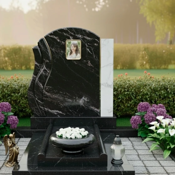 Представленный мемориальный ансамбль, артикул ПН 145, представляет собой гармоничное сочетание классической элегантности и глубокого символизма. Центральная стела выполнена в форме асимметричной арки, где левая сторона плавно изгибается вверх, создавая ощущение легкого, возносящегося движения. Этот изгиб, напоминающий мягкую волну или струящуюся драпировку, придает изделию особую динамику, несмотря на статичность камня. Правая сторона стелы представляет собой строгую, вытянутую вверх колонну, контрастирующую с плавностью левой части и придающую всей композиции устойчивость и величественность. Грани стелы тщательно отполированы до зеркального блеска, что создает завораживающую игру света и тени, подчеркивая глубину черного гранита. В верхней части левой, волнообразной части стелы, расположено овальное обрамление для портрета, выполненное с филигранной точностью и деликатностью. Оно словно заключает в себе лик ушедшего, оберегая его от течения времени. Нижняя часть стелы украшена изящным резным элементом, напоминающим легкую, почти невесомую вуаль, которая лишь подчеркивает общую утонченность дизайна.