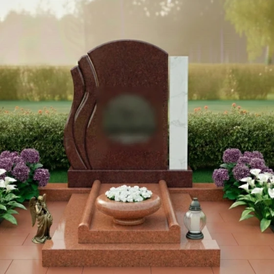 Подножие стелы представляет собой многоуровневую конструкцию, добавляющую композиции объем и значимость. Массивная основа, на которую установлена стела, плавно переходит в широкую надгробную плиту, полностью покрывающую место захоронения. Это решение не только создает законченный и эстетически выверенный вид, но и значительно упрощает уход за местом упокоения. На надгробной плите, по центру, располагается глубокая, чашеобразная ваза для цветов, выполненная в едином стиле с основным комплексом. Ее плавные линии и темный оттенок идеально гармонируют с общим дизайном, предлагая место для живых цветов, как символа непрекращающейся памяти и связи.