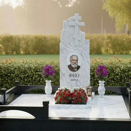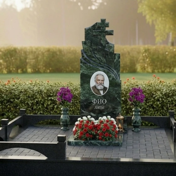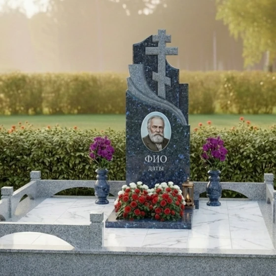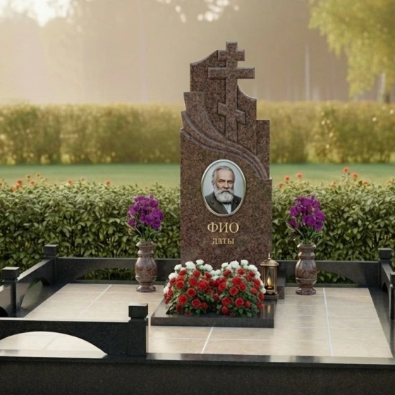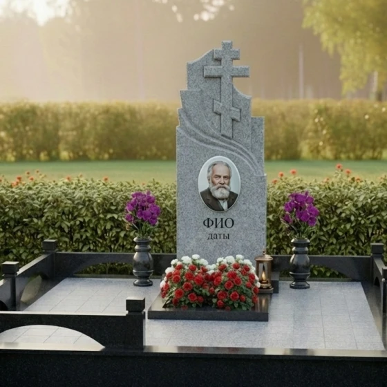 Центральным элементом композиции является массивная стела, выполненная в строгой, но в то же время выразительной форме. Её верхняя часть представляет собой величественное сочетание двух православных крестов, один из которых возвышается над другим, создавая ощущение духовной защиты и вознесения. Кресты отличаются лаконичностью и четкостью линий, без излишних деталей, что подчеркивает их сакральное значение. Справа от вертикального креста, плавно переходя в его основание, вырезан изящный горизонтальный элемент, напоминающий стилизованную драпировку или развевающееся знамя, которое придает монументу динамику и глубину. Левая грань стелы имеет строгую прямолинейную форму, подчеркивая монументальность, в то время как правая грань изящно изогнута, создавая плавную волну, которая смягчает общий облик и добавляет ему художественной выразительности. Все грани стелы тщательно отполированы до зеркального блеска, что позволяет камню играть на свету, отражая окружающий мир и создавая глубокие блики. Контраст полированной поверхности с матовыми, слегка шероховатыми срезами на резных элементах крестов и драпировки, создает удивительную игру фактур, подчеркивая мастерство обработки камня.