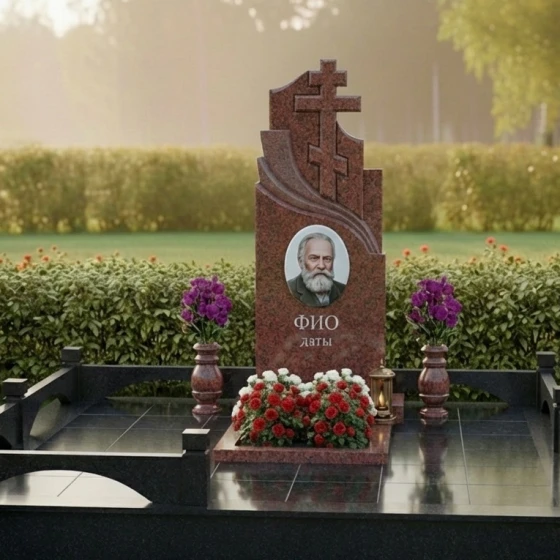 Особое внимание уделено благоустройству прилегающего участка, которое создает единый, гармоничный ансамбль. Монумент установлен на высокий, прочный гранитный цоколь, формирующий четкий периметр участка. Цоколь выполнен из того же камня, что и стела, но с легкой, едва заметной шероховатостью, что придает ему дополнительную устойчивость и монументальность. Надгробная плита, полностью покрывающая участок, выполнена в единой цветовой гамме и фактуре с цоколем, создавая законченный и ухоженный вид. Это решение не только придает композиции целостность, но и значительно упрощает уход за местом захоронения, избавляя от необходимости прополки и поддержания чистоты. По углам цоколя расположены массивные, но элегантные гранитные столбики, которые завершают ограждение, придавая ему благородный и торжественный вид. В центре надгробной плиты, напротив стелы, предусмотрено место для высадки цветов или установки декоративных элементов, что позволяет добавить индивидуальности и живых красок в композицию. По бокам от центральной части расположены две изящные гранитные вазы, предназначенные для свежих цветов, которые привносят в строгий облик монумента нотки нежности и жизни.