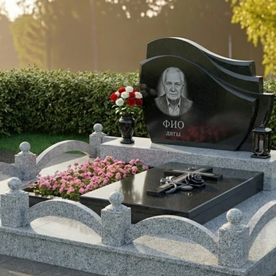 Благоустройство участка продумано до мелочей. Монумент установлен на прочный цоколь из светлого гранита с мелкозернистой структурой. Цоколь имеет среднюю высоту и подчеркивает монументальность композиции. По периметру участка выложены каменные бордюры, формирующие единое пространство. Особенностью является декоративное ограждение из того же светлого гранита, выполненное в виде полукруглых арок, создающих ощущение легкости и воздушности, а также небольших столбиков, завершающих каждый пролет. Внутри этого ограждения, по бокам от надгробной плиты, расположены клумбы, предназначенные для живых цветов, что придает месту ухоженный и живой вид. Надгробная плита, закрывающая все пространство захоронения, создает законченный и аккуратный вид, значительно упрощая уход за местом последнего упокоения. Дополнительные элементы декора включают изящную вазу для цветов и лампаду из черного гранита, которые гармонично дополняют композицию, размещенные на пьедесталах по бокам от стелы.