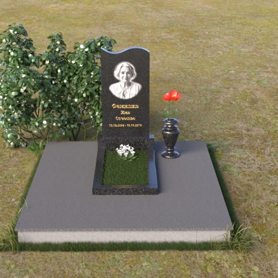 Под стелой располагается горизонтальная плита, также выполненная из полированного гранита, создающая ощущение завершенности и гармонии. Ее зеркальная поверхность отражает небо и облака, словно стирая границу между земным и небесным. Вместе стела и плита образуют единый ансамбль, который органично вписывается в ландшафт, подчеркивая красоту и умиротворение места захоронения. Черный цвет гранита символизирует скорбь и уважение, а его плотная структура гарантирует долговечность и устойчивость к любым погодным условиям. Этот памятник – достойное обрамление памяти о близком человеке, которое будет служить напоминанием о его жизни для будущих поколений.